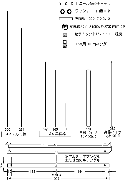 真鍮棒280oの片側を BNC中心コンタクトの穴に入るよう、やすりで鋭くとがらせ半田付けをします。半田ごては100W程度の物を使ってください。それに熱収縮チューブやビニールテープで絶縁を施し、真鍮パイプ6oを通しBNCナットに半田付けを行います。途中5D2Vの内部絶縁体を削った物か、ビニールテープを厚巻きにした物を入れて置くと中心が保たれFBです。