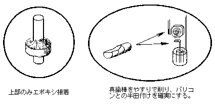 次に真鍮棒 100oをトリマーに半田付けしますが、先ほど同様に片側を平らに削っておくと確実になります。その後トリマーと真鍮棒165oの間にアクリル板等の小片を接着することにより、ガタツキがなくなります。