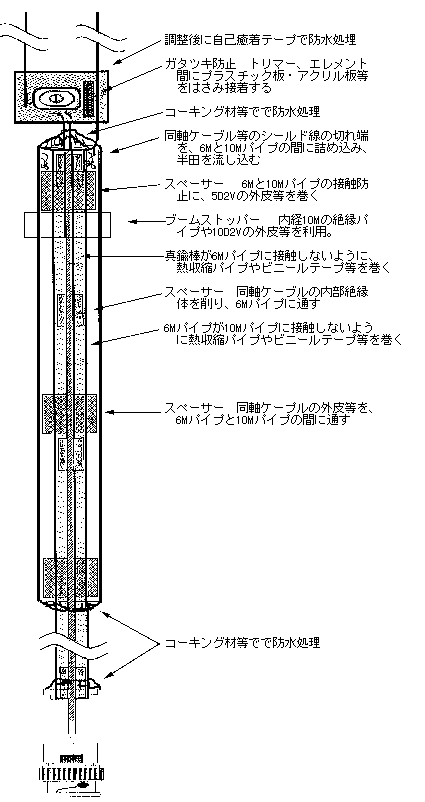 次にブームストッパーの絶縁パイプを10oパイプに通し、 BNCの近くまで下げておいてください。下げ忘れると半田の熱で融けてしまうことがあります。