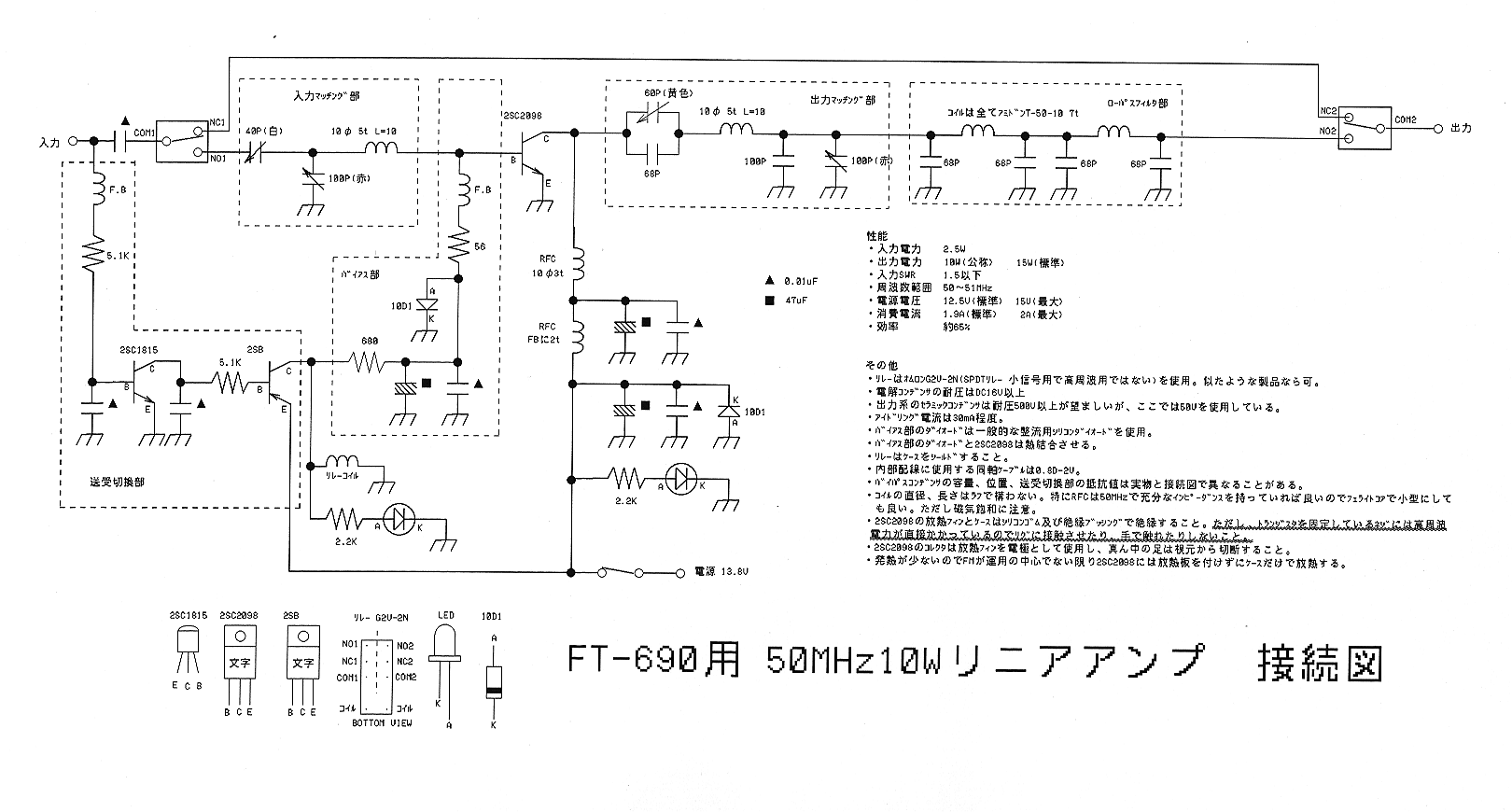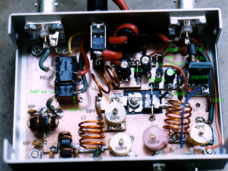 バイアス部の10D1は、2SC2098の上面に接触させて、シリコングリスを塗って熱的に結合させます。抵抗、コンデンサ等の部品の足はできるだけ短くカットして、最短距離で半田付けして下さい。安定動作の秘訣です。部品を取って再利用しよう、なんて考えて足を長めにしてはいけません。動作不良のトラブルに泣かされます。イモ半田にも注意。また、時々ケースに入れてみて、部品がコネクタやスイッチに当たらないか確認して下さい。リレー周囲の配線はケースに組み込む段階で行いますのでまだ行わないで下さい。図に示した範囲を組み立てます。