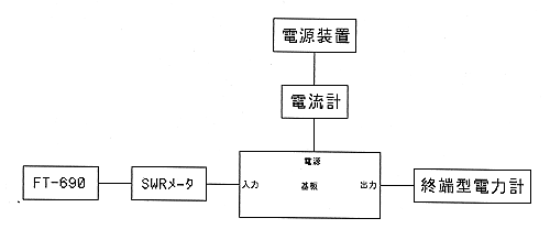 図のように接続し、690をFMモードにして、自分のよく使う周波数に合わせます。2.5Wで送信し、SWR計の表示は無視してパワーメータだけ見ながら、入力マッチング回路の2つのトリマ、続いて出力マッチング回路の2つのトリマを、出力が最大になるように調整します。もし、トリマの羽がいっぱいに入ったり、逆に抜けきったところで最大パワーになる場合は、コイルを延ばしたり縮めたりして、もう一度調整します。どうしてもうまく行かないときにはトリマと並列に入っている固定コンデンサの値を増減したり、コイルの巻き数を1回増減させて再調整します。ほとんどの場合はコイルの巻き数を変更する必要はないはずです。うまく調整できれば10W近く出ます。なお、調整中はまだアンプのSWRが高い状態で、親機に悪影響を与えますので、できるだけ短時間の送信で調整して下さい。