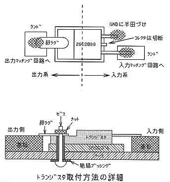 さて、いよいよ基板の半田付けです。 部品配置の写真を参考にしながら、現物の部品に合わせながらランドを貼り付けて半田付けしていきます。最初に2SC2098を半田付けし、ここを基準に回りの部品配置を決めます。トランジスタの取り付けは少し変わった方法を採用しました。入出力を分離して安定動作を確保する狙いのためです。トランジスタの3本の足の真ん中がコレクタですが、実は放熱フィンはコレクタに接続されています。ベースとコレクタが隣り合っていますので、このままだと入出力のマッチング回路が接近し、磁界やストレーキャパシタを介して結合し、発振する恐れがあります。そこで、真ん中のコレクタは根元で切断し、放熱フィンから卵ラグでコレクタと接続します。この方法ですとトランジスタの頭とお尻に入出力が物理的に分離されて発振しにくくなります。放熱フィンはコレクタに接続されているので、ケース(GND)と絶縁する必要があります。ケースとの間にシリコンゴム板をはさみ、取り付けネジは絶縁ブッシングを通します。ただし、ケースへの取り付けはまだ行いません。この方法ですとネジには高周波信号が直接かかってしまい、運用中に触れたり、リグと接触させると危険です。本当は図とは逆に絶縁ブッシングをトランジスタ側に取り付けるといいのですが、それには卵ラグの穴を4mmに広げる必要があります。ところが、卵ラグは薄い金属板で強度が弱く、ドリルで穴を広げようとしても変形してしまい加工できません。ヤスリで根気よく削ればいいのですが、手間がかかるので今回は上記のような固定方法で妥協しています。新たに製作されるみなさんは、反対にした方が無難です。